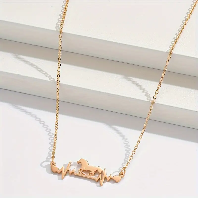 Sa délicate chaîne dorée met en valeur un pendentif original représentant un cheval courant sur une ligne de rythme cardiaque – symbole parfait de la vie, de la liberté et de l’amour équestre.