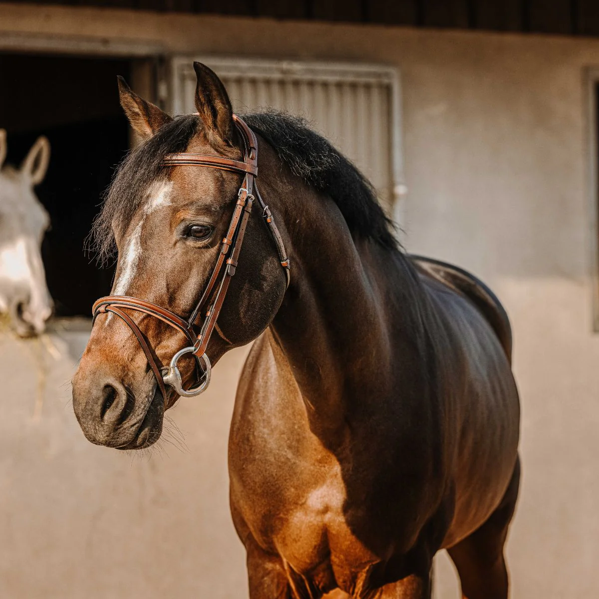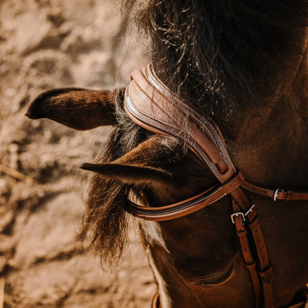 Ligne sobre et chic, avec des pièces bombées et surpiquées qui soulignent la qualité artisanale du bridon.
