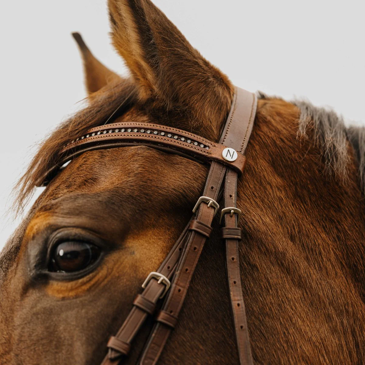 Filet NORTON – Strass Confort souple grâce à la muserolle combinée doublée de cuir de vachette, pour un bon maintien sans rigidité. Un frontal en V orné d’inserts en strass, pour une touche brillante sans excès. Cuir huilé résistant, conçu pour durer tout en conservant sa souplesse. Bouclerie inoxydable, pratique et durable. Composition : Cuir […]