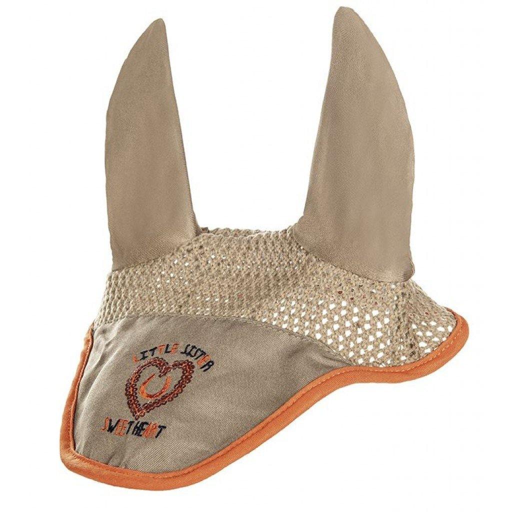Little Sister Sweetheart Bonnet anti mouches par HKM.Protege les oreilles de votre poney ou Shetland contre les insects avec ce super bonnet avec une logo en coeur brilliant. Couleurs: Rose/Taupe, Taupe/Orange