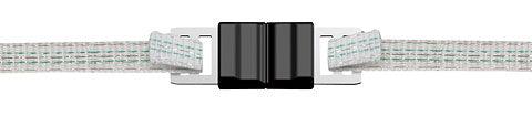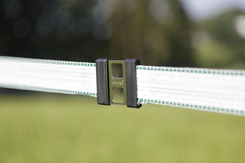 Litzclip connecteur ruban en inox, raccordement facile de 2 extrémités de rubanpour réparer rapidement un ruban de clôture endommagé.Ouvertures perforées spéciales, fines et rectangulaires, pour faciliter l’introduction et la fixation du ruban
