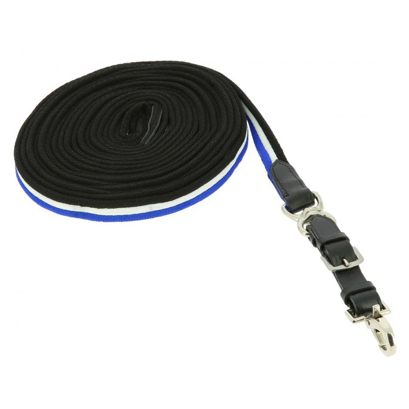Nous vous présentons la longe de travail NORTON matelassée/cuir Noir/blanc/bleu Polyester matelassé avec renfort et passant réglable en cuir de buffle Mousqueton tournant en zinc, permettant le montage en gourmette. Taille 8 mètres de longueur