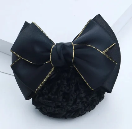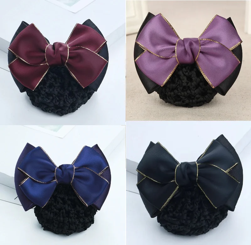 Tres élégante resille pour vos concours de dressage, barrette avec un noeud en satinet des bords dorés.Fini avec un clip argenté et un filet, le filet sur la marine est bleu marine et non noir.
