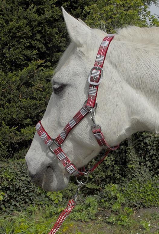 Licol de qualité pour votre cheval ou poney en couleurs ecossé en tissu forte mais douce au toucher avec tetiere et muserolle réglable. Tetiere, muserolle et montants rembourrés, doublés de velours.