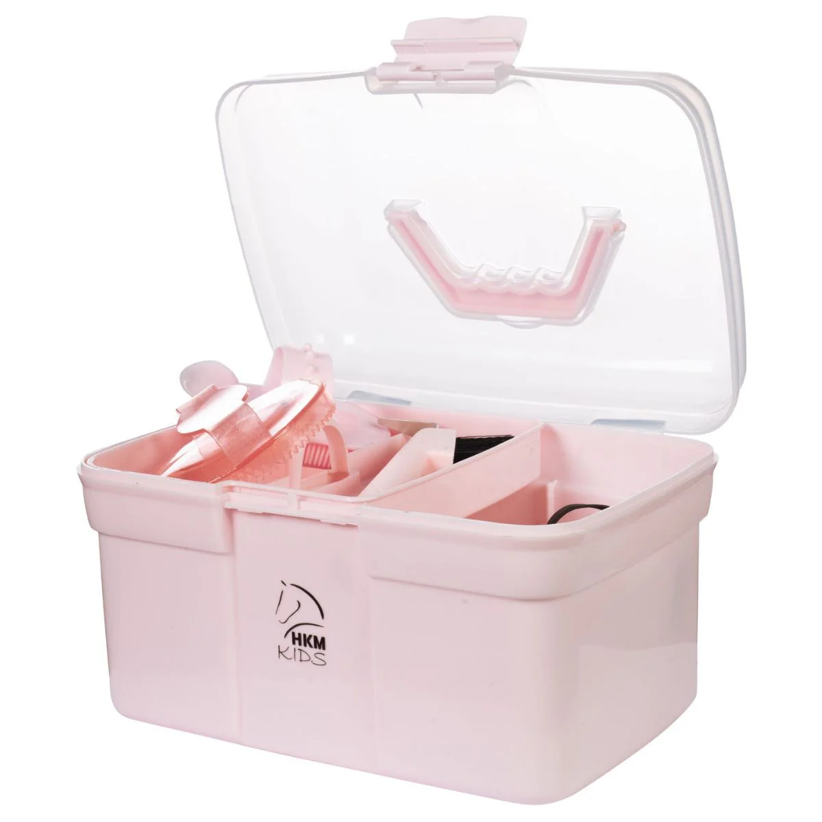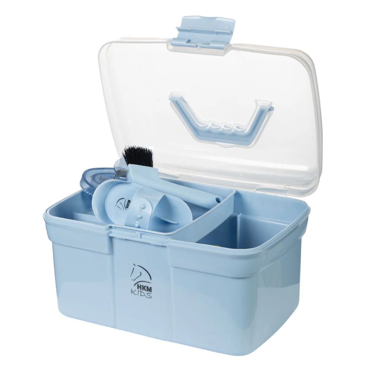Dans son coffret coloré (rose ou bleu), on retrouve 7 accessoires indispensables : un cure-pied, une brosse douce, un peigne à crinière, deux étrilles différentes, une éponge et un couteau de chaleur. Tout est réuni pour un pansage efficace et amusant.
