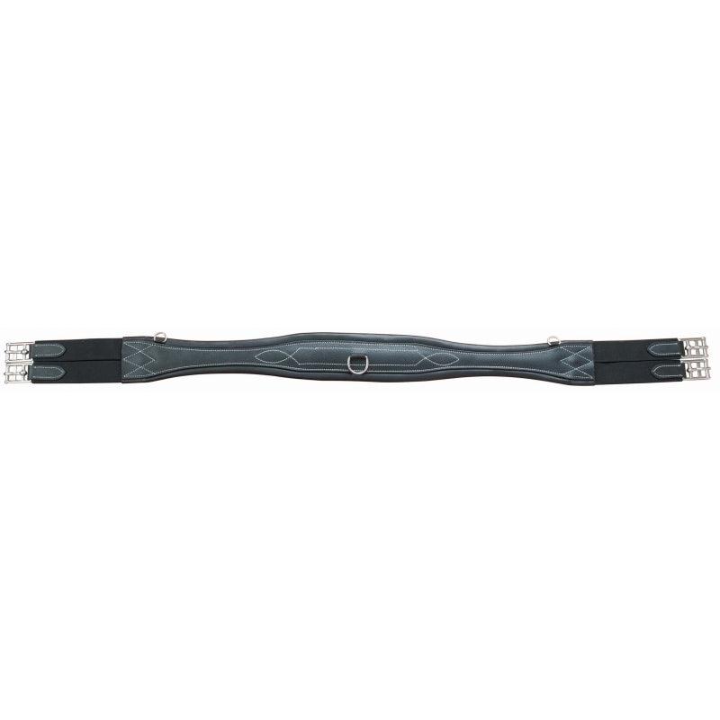 Sangle pour votre cheval en cuir grainé à la découpe anatomique, doublée cuir. Chaque sanglon est composé de 3 élastiques 38mm de chaque côté, boucles inox à rouleaux pour faciliter le sanglage et protéger les sanglons, rembourrage mousse pour le confort, couture décorative.